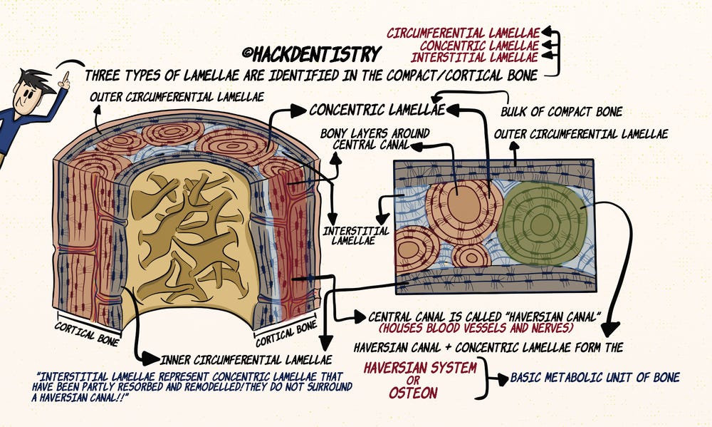 Histologically three types of lamellae can be identified in the compact bone, them being circumferential, concentric and interstitial lamellae.