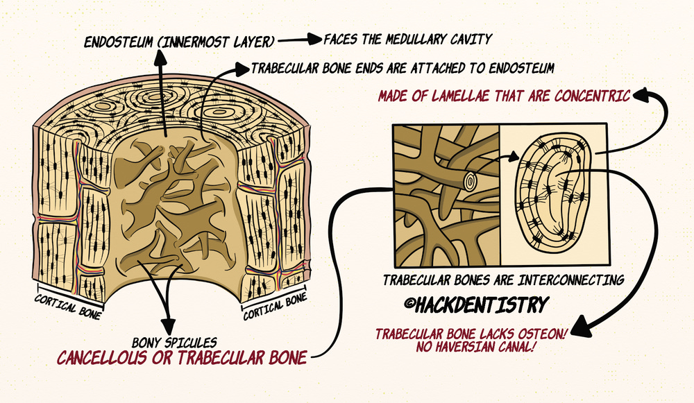 Like the compact bone, the trabecular bone is also made of lamellae that are concentric. However, trabecular bone does not have osteons like in the compact bone.