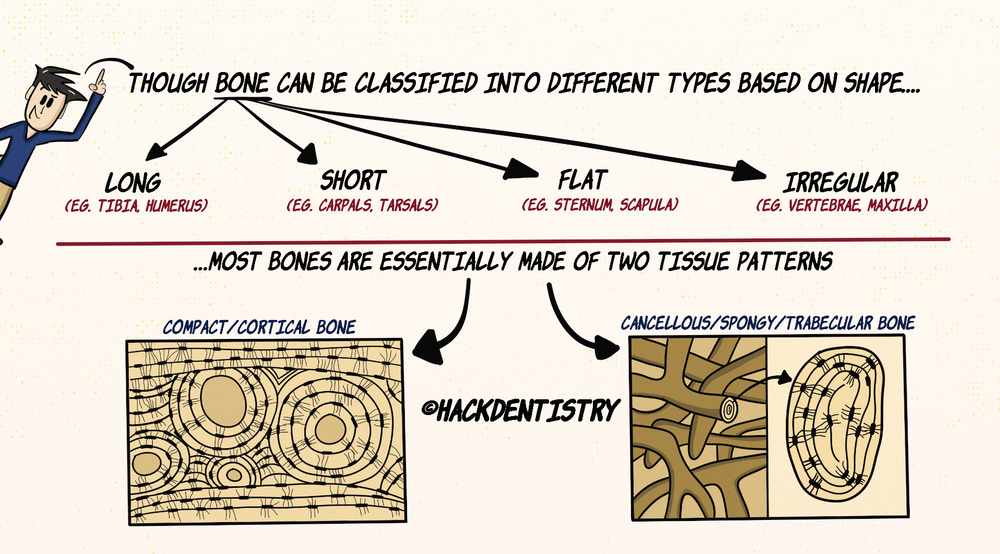 Though bone can be classified into different types based on its shape as long (eg.tibia, humerus), short (eg.carpals, tarsals), flat (eg.sternum,scapula) or irregular(vertebrae, maxilla); most bones are essentially made of two tissue patterns called