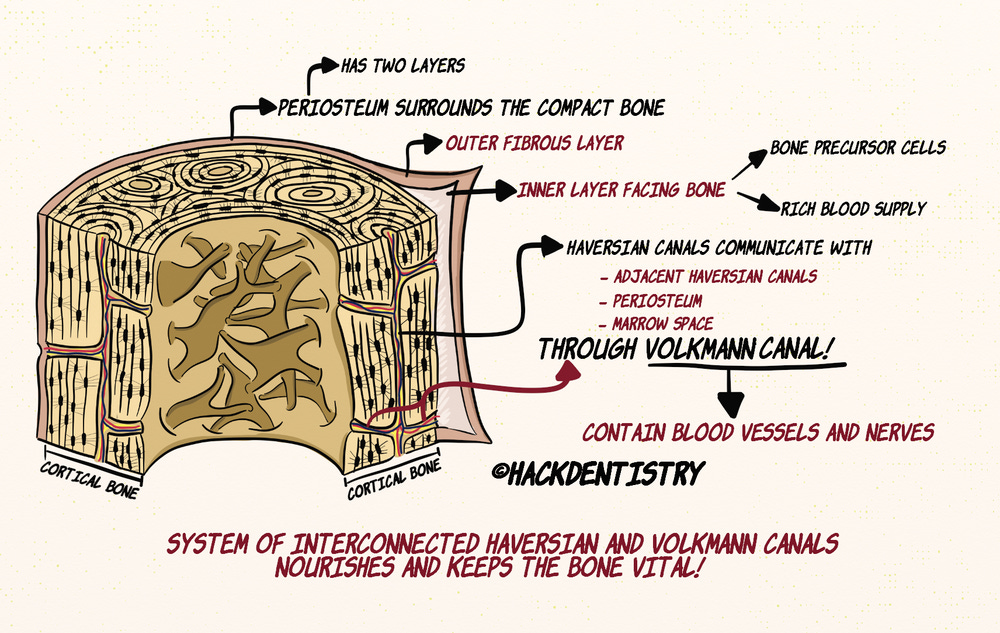 The outer most layer of the compact bone is surrounded by a periosteum having two layers; an outer fibrous layer and an inner layer facing the bone, having precursor bone cells and a rich blood supply.