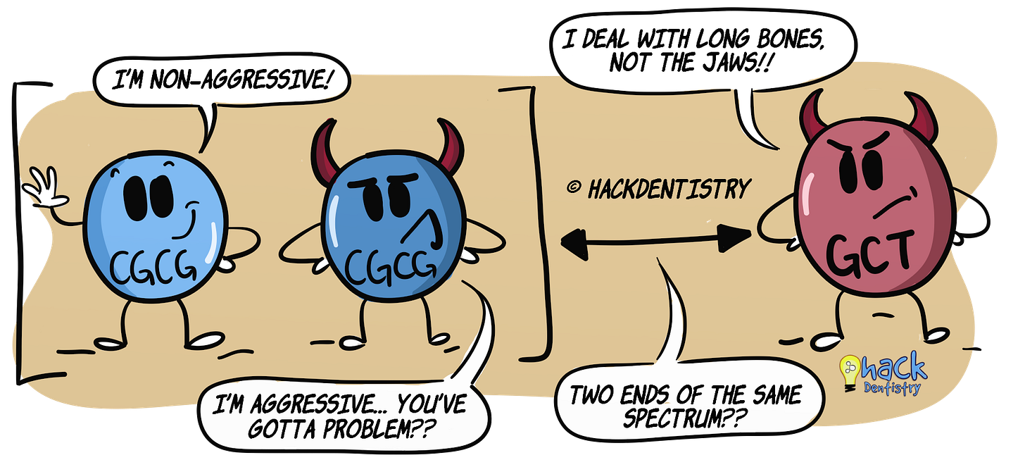 However, CGCG occasionally exhibits aggressive behaviour and is also thought to be related to its aggressive long bone counterpart - Giant cell tumor (GCT).