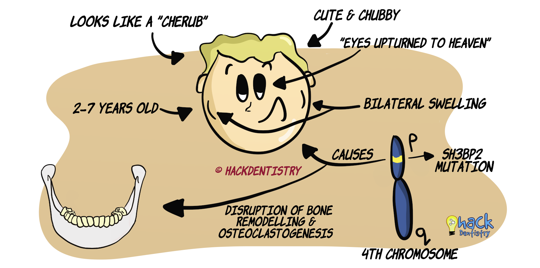 Cherubism is a hereditary, developmental condition that causes bilateral, symmetrical swelling of the jaws affecting children usually between 2-7 years.