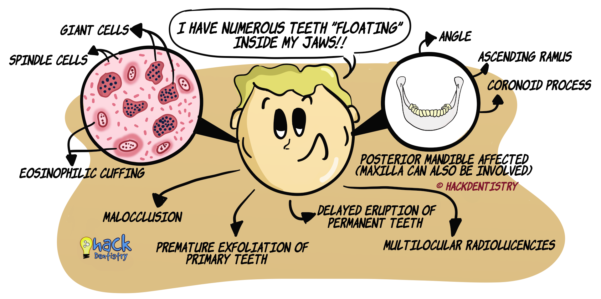 Cherubism mostly involves the posterior mandible --> angles, ascending rami and coronoid processes. The condyles are mostly, not affected.