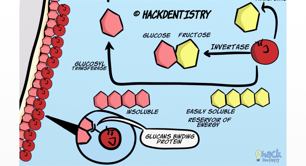 Using another set of enzymes called glucosyl transferase and fructosyl transferase, S.mutans further converts glucose and fructose to extra-cellular polysaccharides called glucans and fructans respectively.