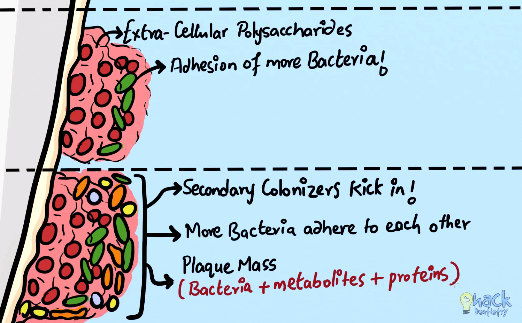 Secondary colonizers kick in afterwards and bacteria continue to grow and adhere to each other.