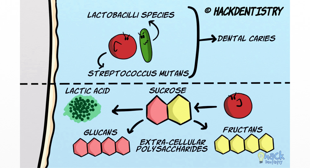 Streptococcus mutans and lactobacilli species have been implicated in causing dental caries. S.mutans metabolizes most of sucrose to meet its energy needs and produces lactic acid. Some of sucrose is also used to form extra-cellular polysaccharides like glucans and fructans.