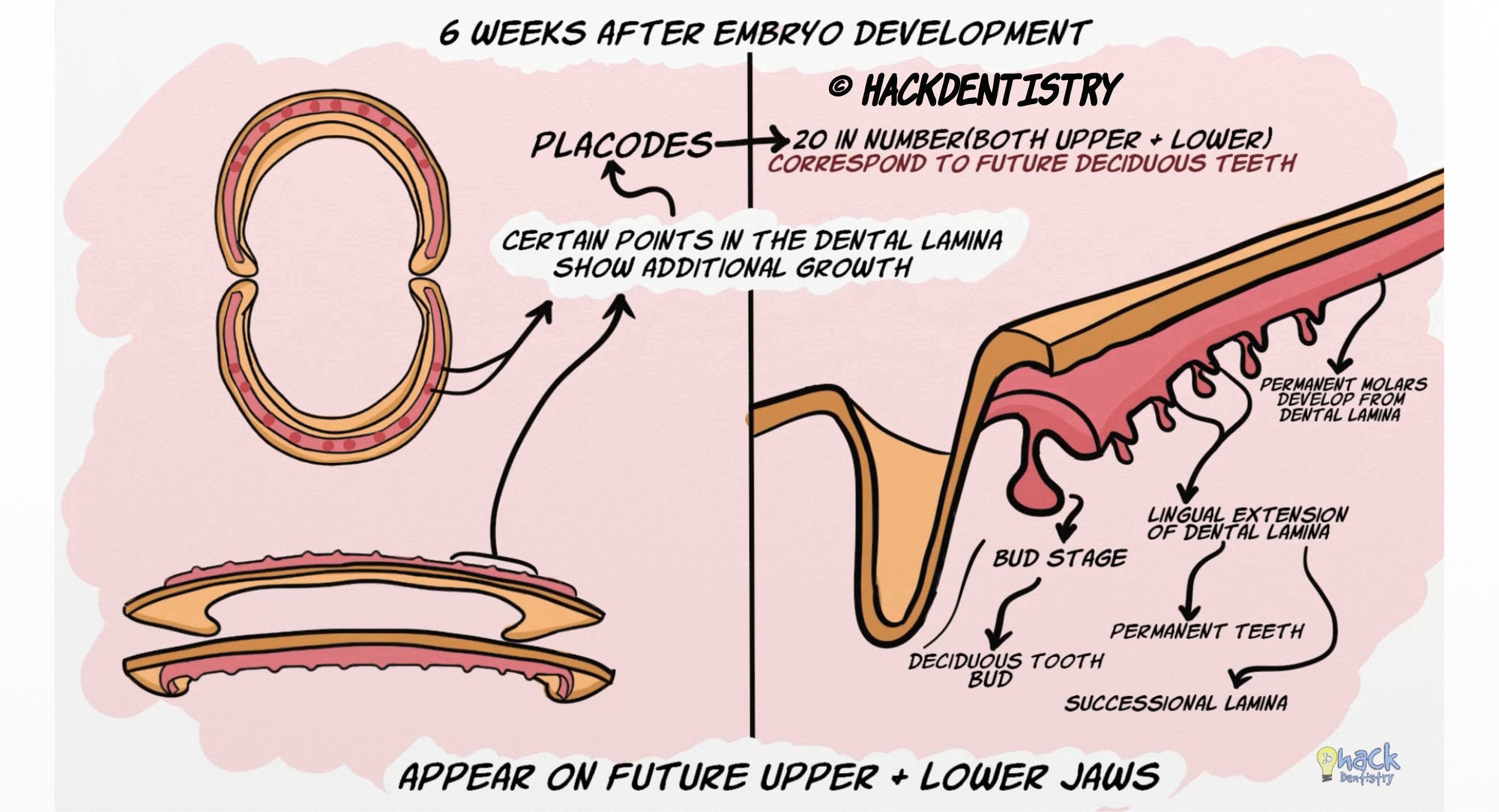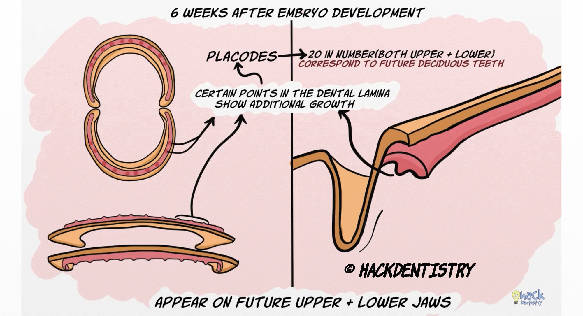 Now, certain points in the dental lamina would develop an additional growth of cells called placodes that protrude into the underlying mesenchyme. These points, 20 in number (both upper and lower) correspond to the sites of the future deciduous teeth.