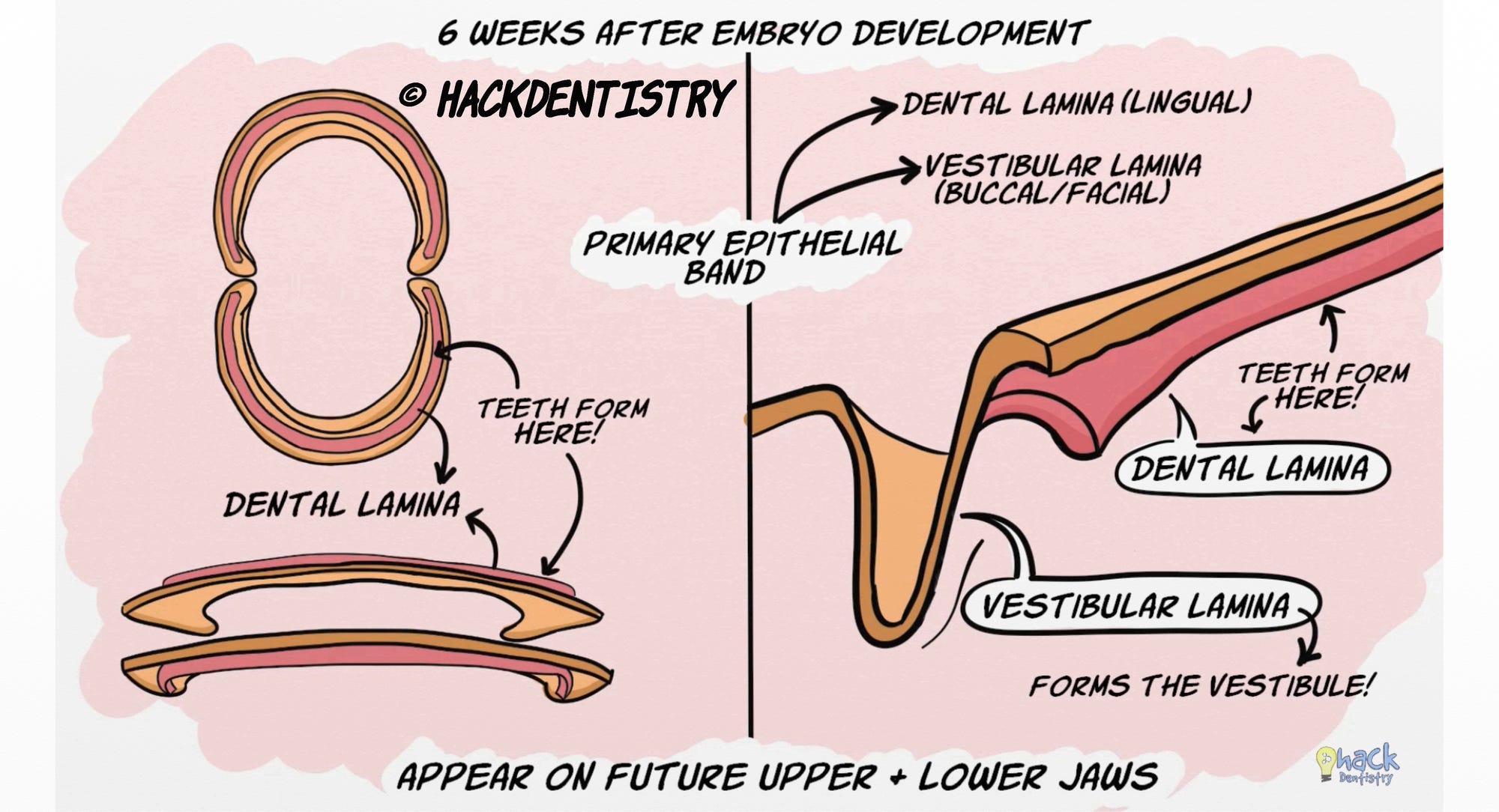 This epithelial band bifurcates into a lingual process called the dental lamina and a buccal or facial growth called vestibular lamina. It is on the dental lamina that the teeth will form and the vestibular lamina would eventually give rise to the oral vestibule between the teeth and cheeks.