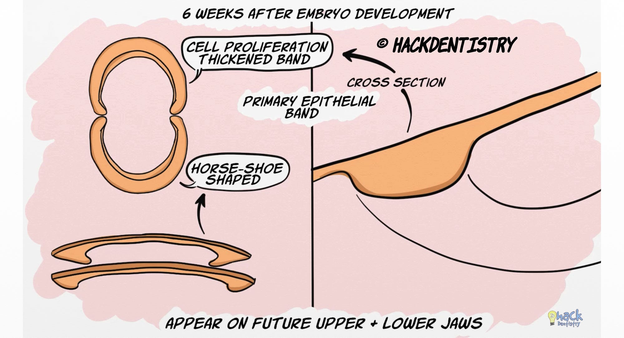 After about six weeks of development of the embryo, a proliferation of cells in the form of a thickened band appears in the presumptive or developing upper and lower jaws.