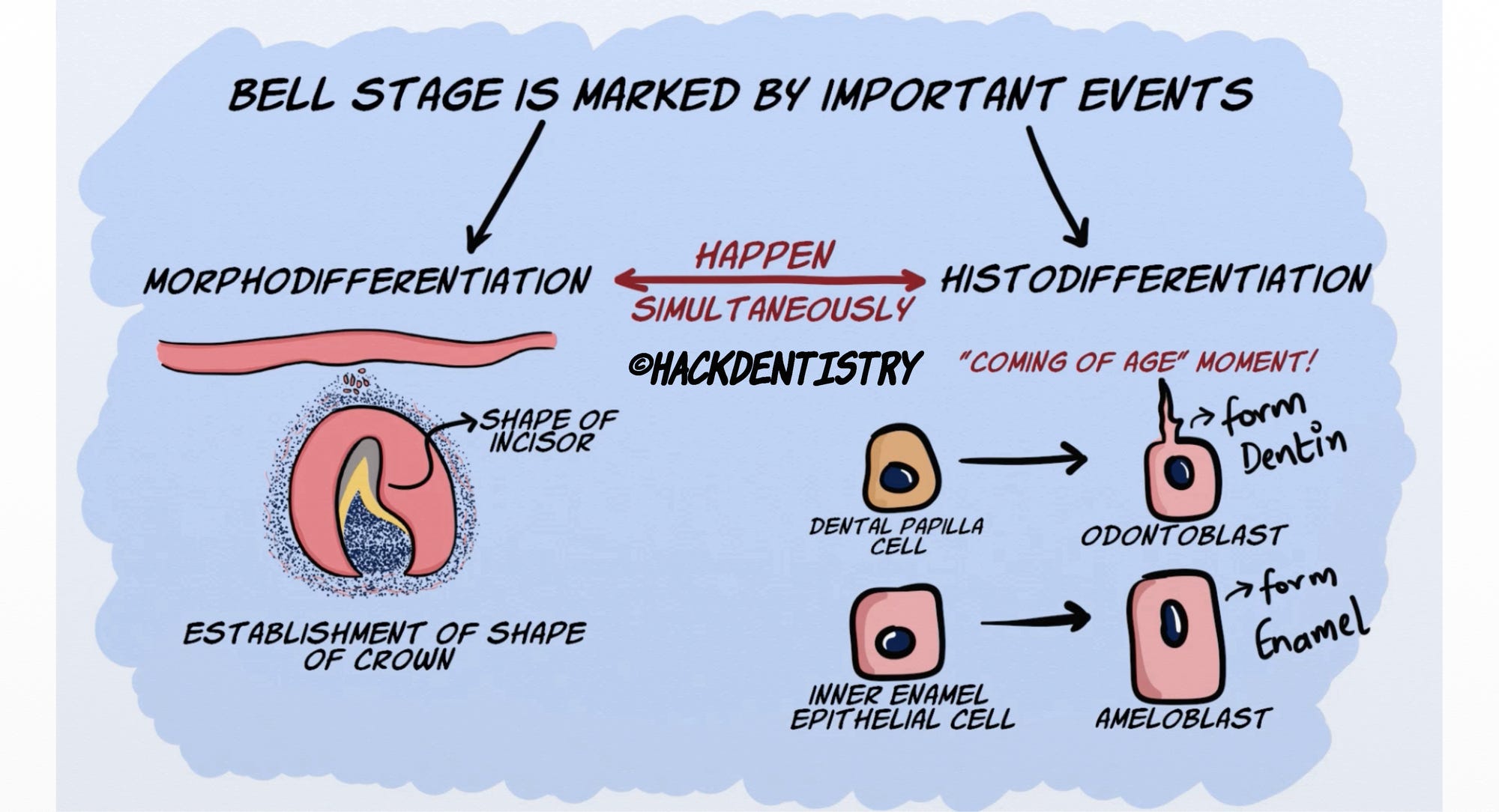The bell stage is marked by two events called morphodifferentiation and histodifferentiation, both happening simultaneously.