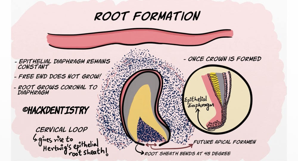 Once the crown is formed, the rim of the enamel organ at the cervical portion comprises the inner and outer enamel epithelium and is called the cervical loop. This cervical loop starts to proliferate to give rise to the Hertwig’s epithelial root sheath.Root Sheath and Epithelial Diaphragm