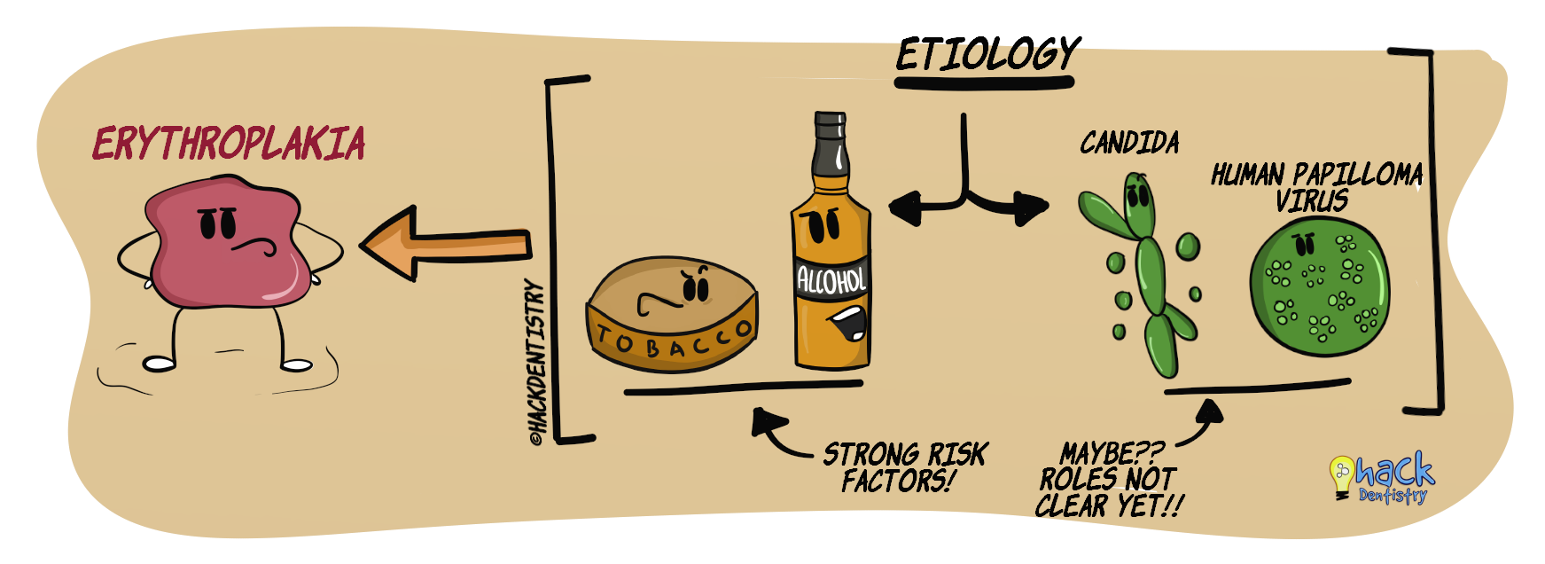 Erythroplakia is a diagnosis of exclusion. There are a number of red lesions in the oral cavity resembling erythroplakia. These lesions are clinico-histopathologically definable lesions. For example, oral lichen planus (OLP) may manifest as an atrophic or erosive red lesion resembling erythroplakia. However, OLP has definitive clinical (white striae elsewhere in the oral cavity) and histopathology features. A clinician should rule out such definitive red lesions, before a clinical diagnosis of “erythroplakia” can be made.Tobacco and alcohol are suggested to be important etiologic factors in causing erythroplakia.