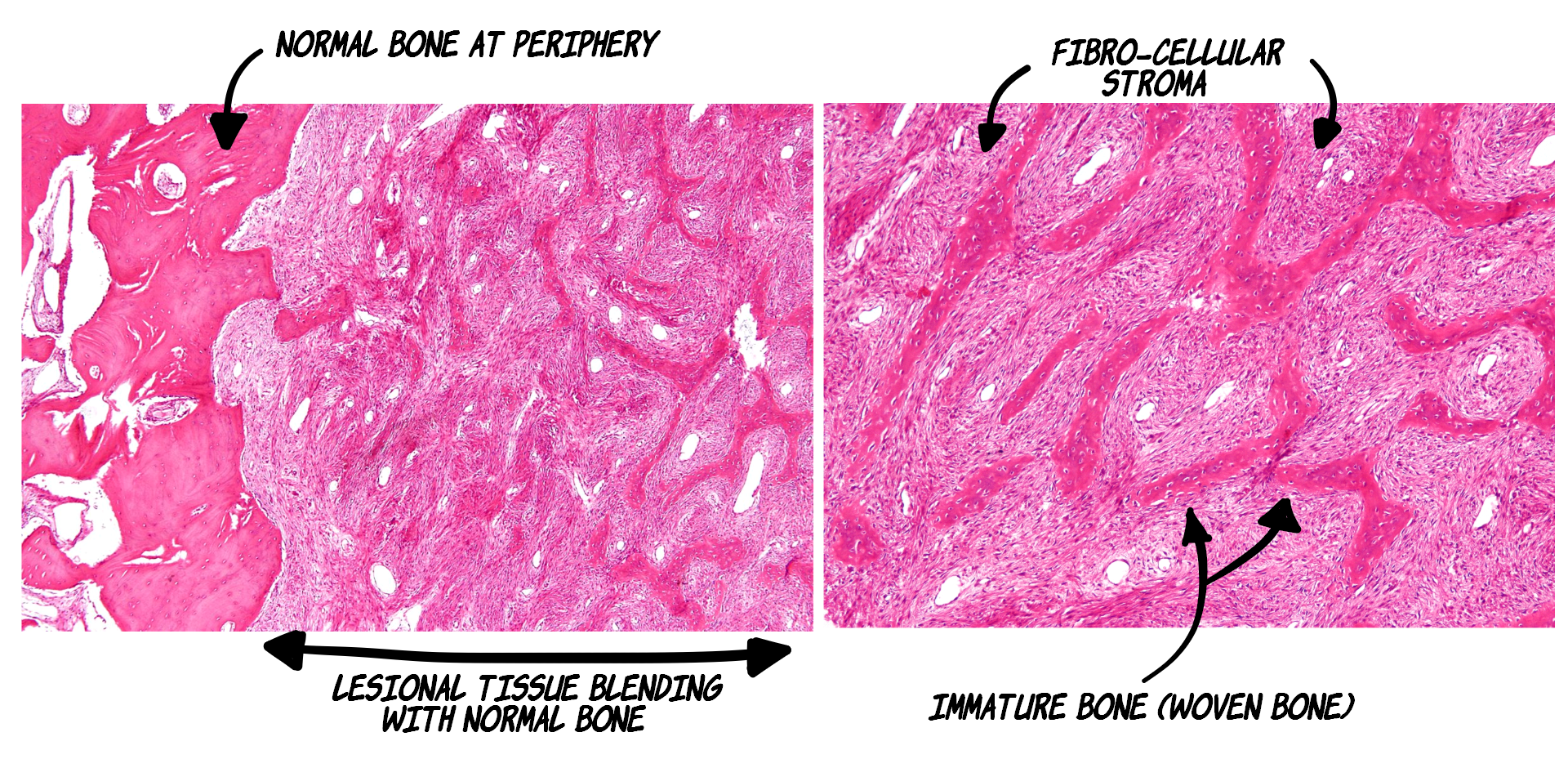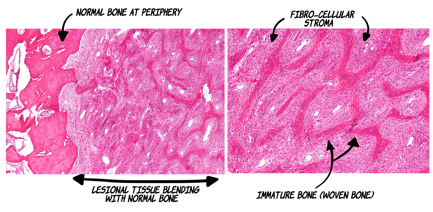 Presence of numerous immature/woven bone trabeculae in a mild to moderately cellular, fibrous connective tissue.
