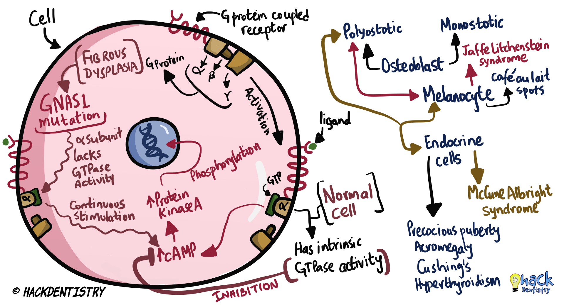 Hence there is uncontrolled production of cAMP --> leading to uncontrolled and abnormal proliferation of cells (osteoblastic, melanocytic or endocrine).