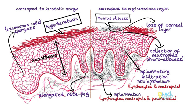 Areas corresponding to the central erythematous portion of the lesion show an intra-epithelial infiltration of neutrophils and lymphocytes and loss of keratin layer. This collection of neutrophils in the corneal layer is a micro-abscess and is called Munro’s abscess.