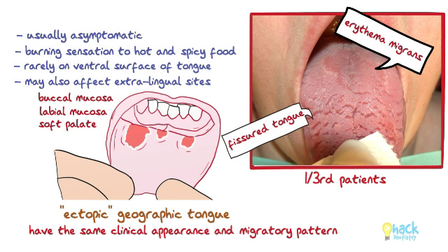 Besides occurring on the dorsal and lateral tongue, these lesions may also rarely affect the ventral tongue and other mucosal sites, like buccal mucosa, labial mucosa and soft palate. These “ectopic”, extra-lingual lesions (ectopic geographic tongue) have the same clinical appearance and migratory pattern as the lesions appearing on the tongue.