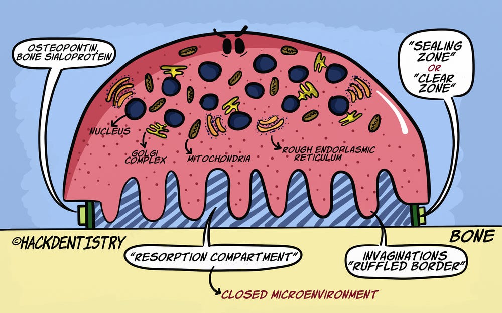 The plasma membrane of the osteoclast, then attaches to the bone, via proteins like osteopontin and bone sialoprotein (BSP). These attachments are called “sealing zones” or “clear zones”.
