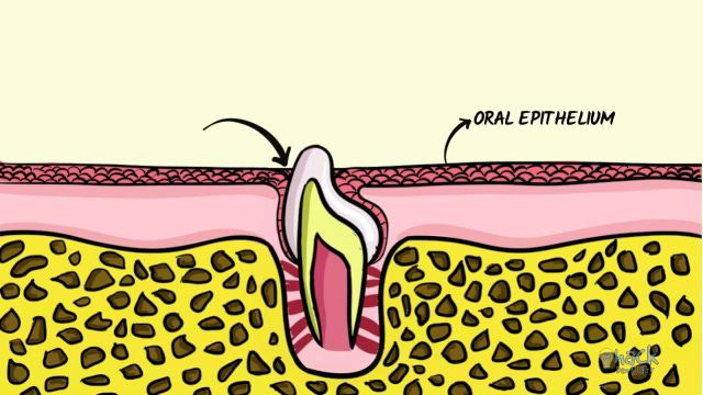 As the tooth starts to move upward and erupts through the oral mucosa, the reduced enamel epithelium fuses with the overlying oral epithelium to form the junctional epithelium or the attachment epithelium.Once the tooth is fully erupted, there is a dento-gingival junction established; a junction between the tooth and the gingiva.