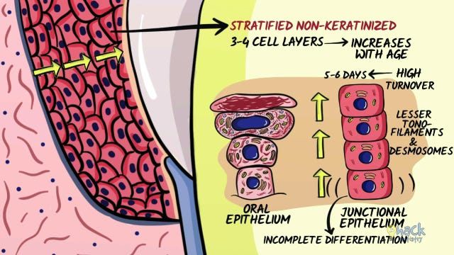 Like, rest of the oral epithelium, the junctional epithelium too, keeps proliferating in the deep layers and moves up layers to replace cells that are shed.