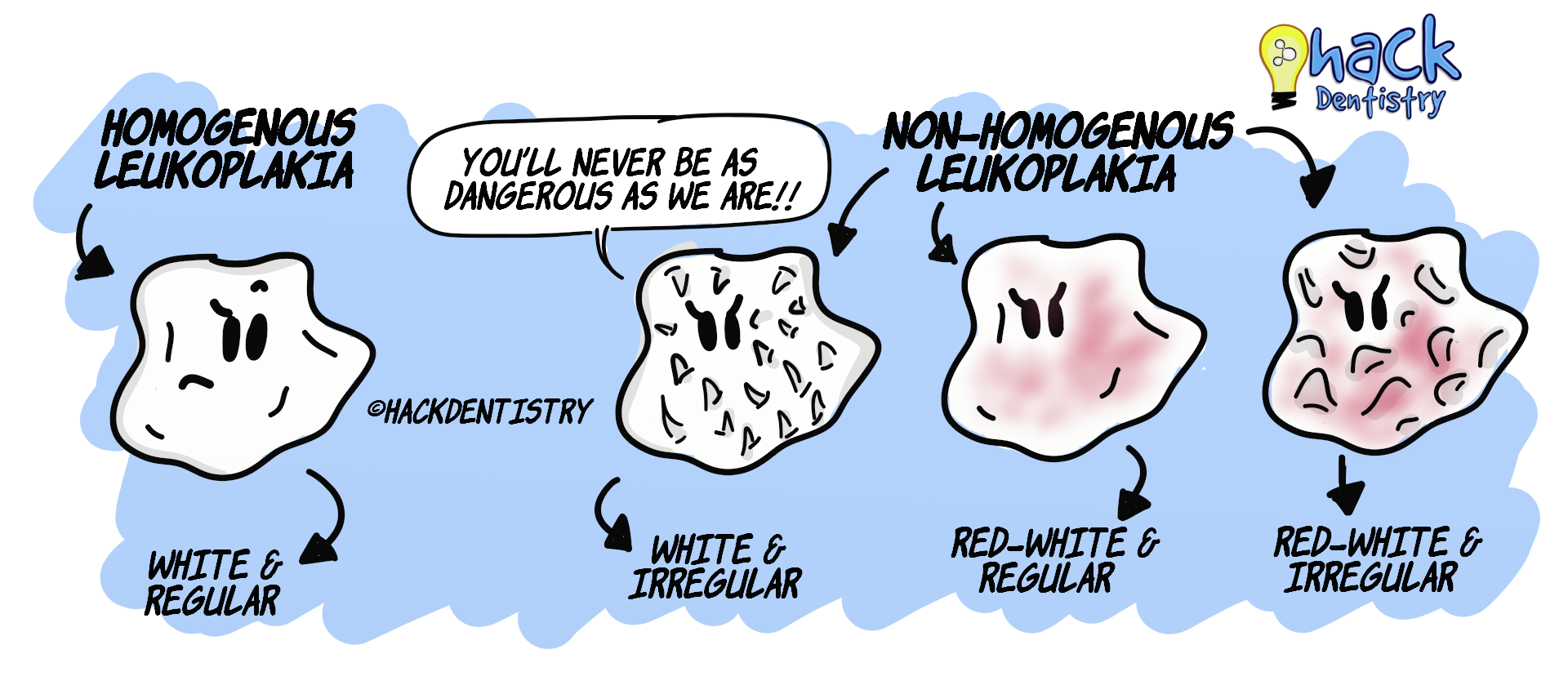 Homogenous leukoplakia --> white colour & regular (surface) texture.