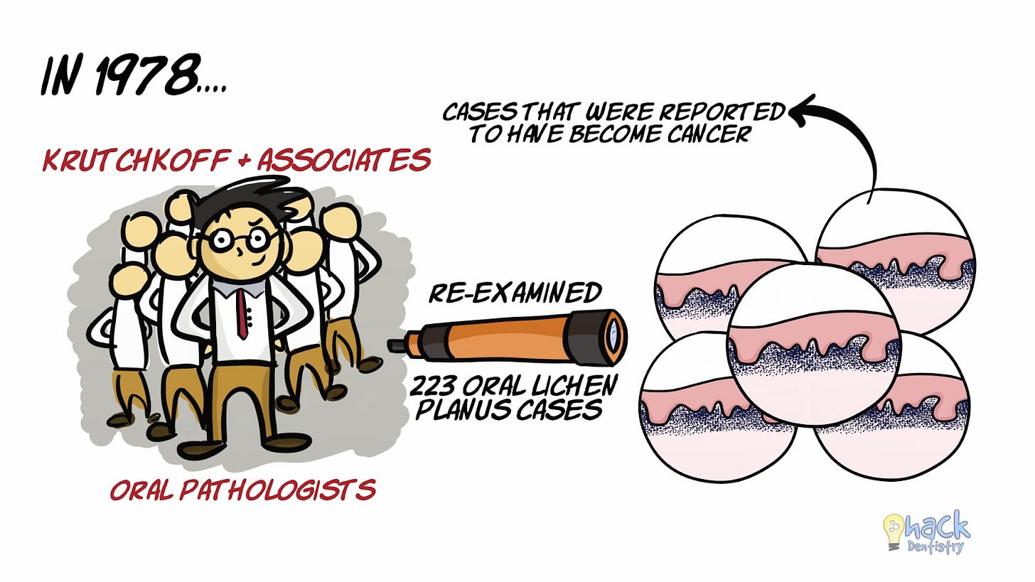 In 1978, Krutchkoff and associates, re-examined 223 cases of OLP that were reported to have become malignant.