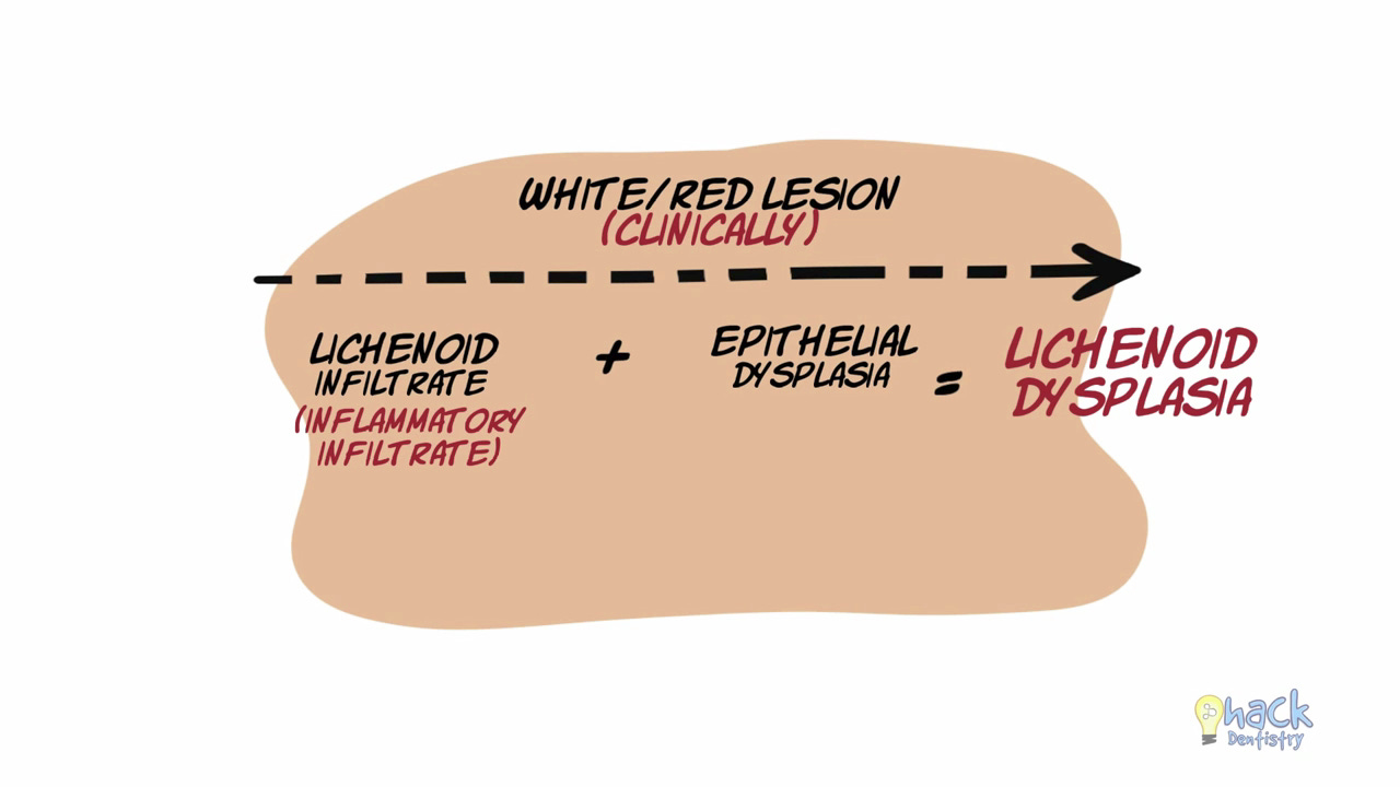These lesions may actually represent cases of leukoplakia or erythroplakia, merely in addition to dysplasia, showing a lichenoid infiltrate.