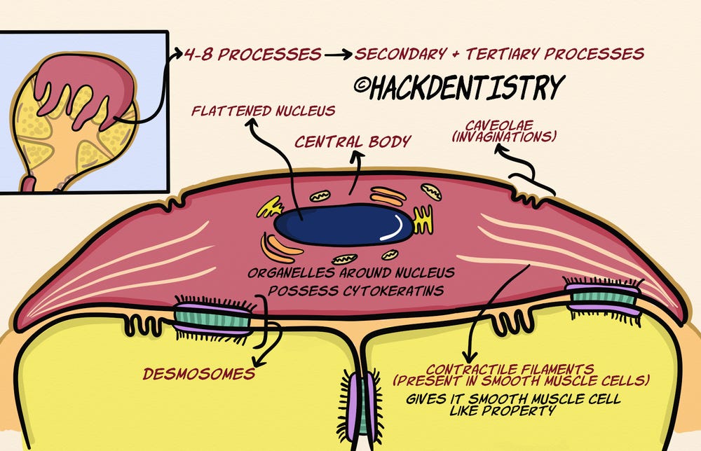 Myoepithelial cells have a central body with 4-8 cytoplasmic processes. These processes may further branch out to secondary and tertiary processes thus securely hugging the acinar cells.