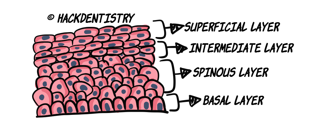 The non-keratinized epithelium consists of 4 (or 3) layers or strata namely -> stratum basale, spinosum, intermedium and superficiale.