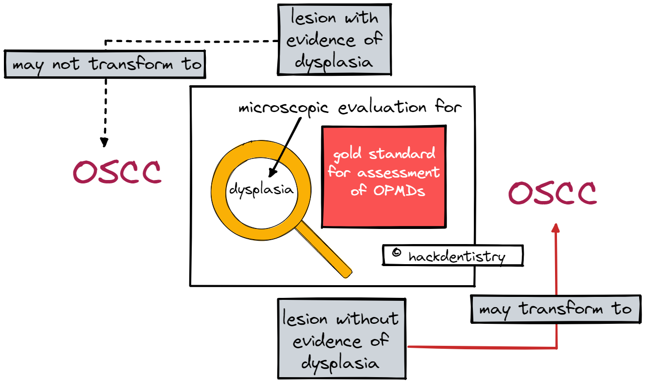 The microscopic evaluation for the presence of epithelial dysplasia in OPMDs remains the gold standard for the assessment of these lesions. It is believed that OPMDs with epithelial dysplasia have more chances of malignant transformation. Currently available molecular markers have not been proved to be of able predictors of malignant transformation.