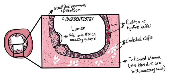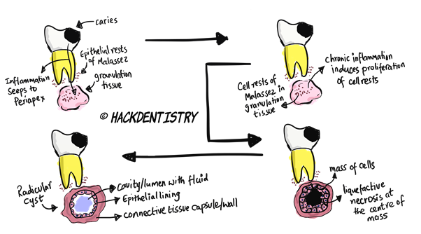 - Cells (of Malassez) proliferate --> form a mass of cells -> cells in the centre are away from the nutrients provided by the connective tissue --> undergo ischaemic liquefactive necrosis. This creates a central cavity surrounded by a viable epithelium.