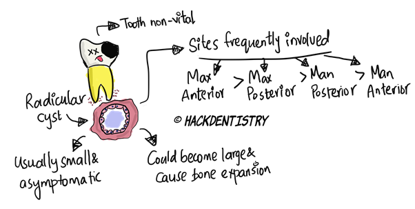 Radicular cysts are usually small and asymptomatic; they may be rarely painful and large causing bony expansion.