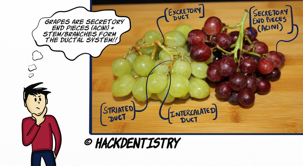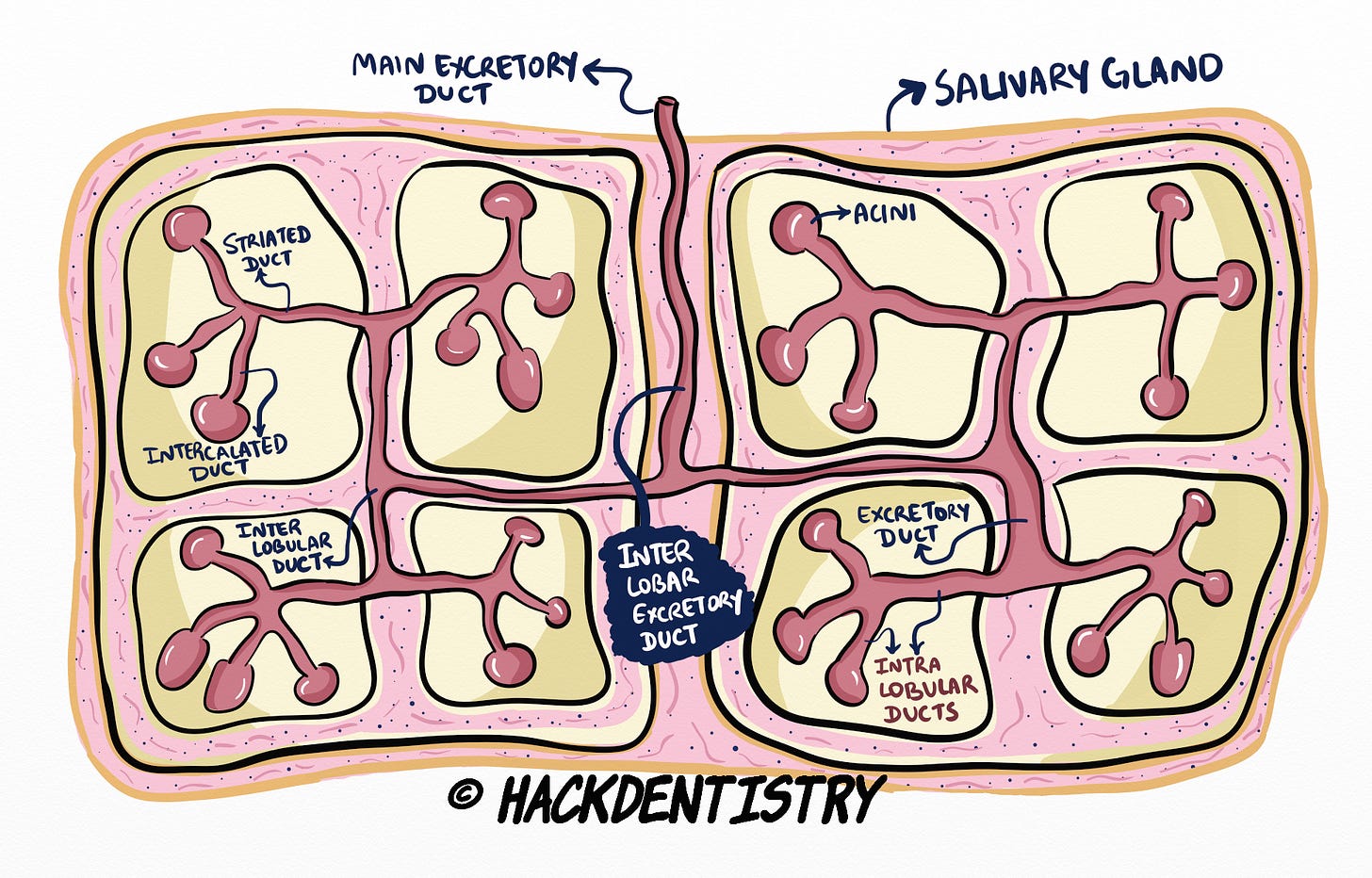 This architecture of the salivary glands can be compared to a bunch of grapes, where the grapes represent the secretory end pieces (acini) and the stem/branches represent the ducts.LOBULAR ARCHITECTURE