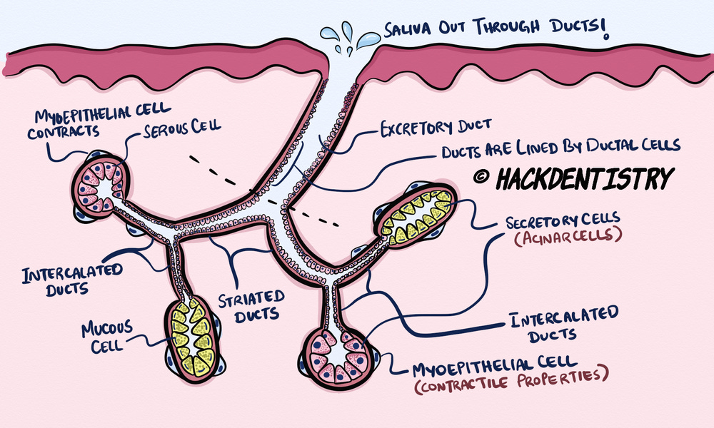 The saliva secreted by acinar cells pass through the ducts to be excreted finally via the excretory duct into the oral cavity.
