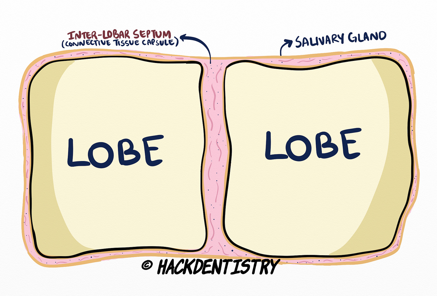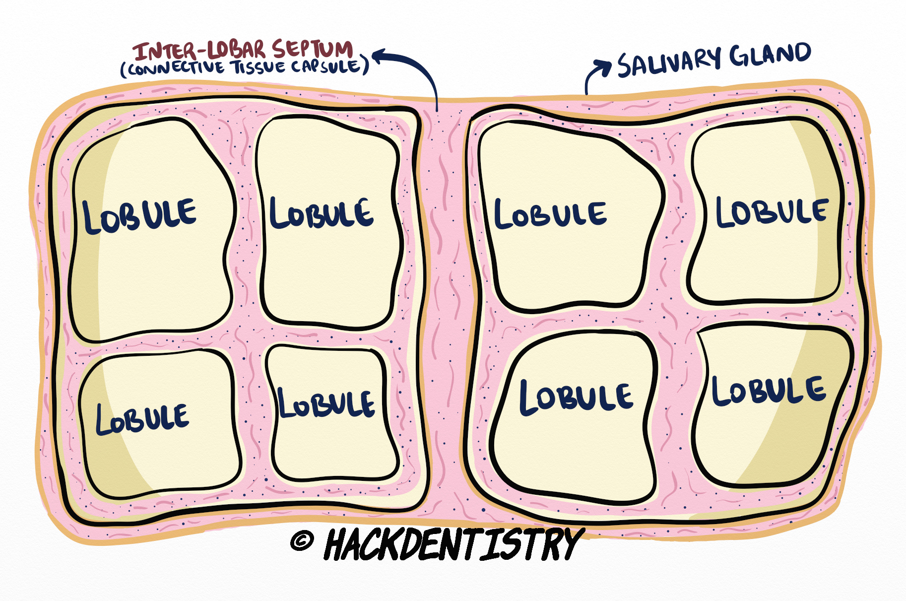 Salivary glands are basically enclosed by a connective tissue capsule that branches into inter-lobar septa (singular-septum) to divide the parenchyma/functional tissues into lobes.