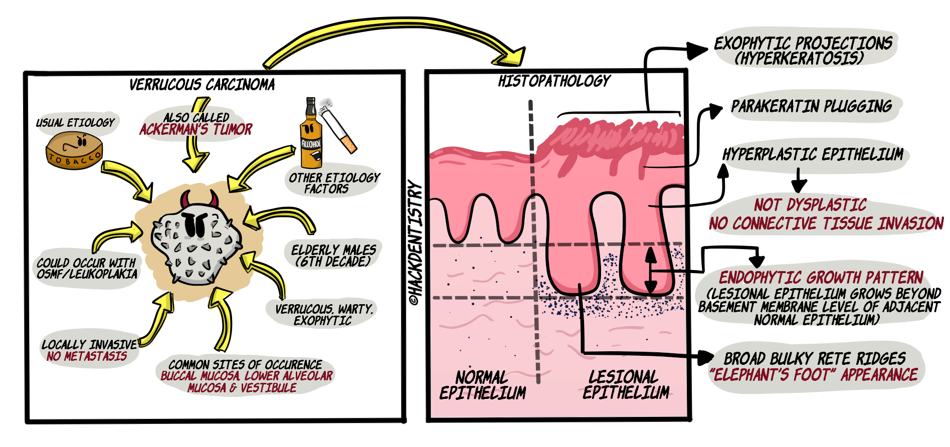 Unlike OSCC, VC rarely exhibits regional or distant metastasis. VC however, is locally invasive and pushes into adjacent or surrounding tissues.